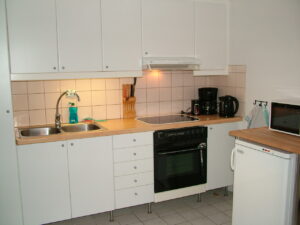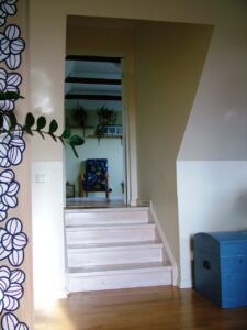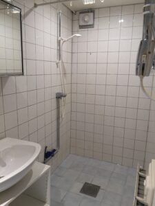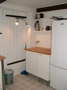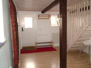 Bottenplan: Sovrum med lättstädat laminatgolv. Förrum med plats för hall, förvaring och matplats med trevlig utsikt på grönområde. Komplett kök med klinkers och golvvärme. Förberett om man vill ha diskmaskin. En fin gammal dörr som förr gick till maskinhallen finns fortfarande kvar i köket (igenmurad). Helkaklat badrum med WC, handfat och dusch, handdukstork och golvvärme.