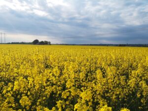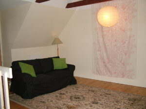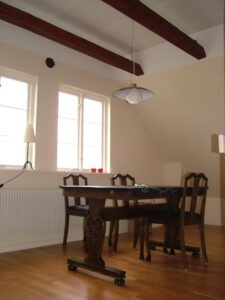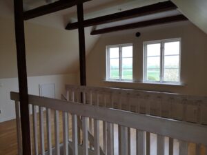 Ovanvåning: Ett stort allrum med en fantastisk utsikt över slätten genom spröjsade fönster. Här finns gott om utrymme både för soffgruppen såväl som för en fin matplats. Ekparkett.